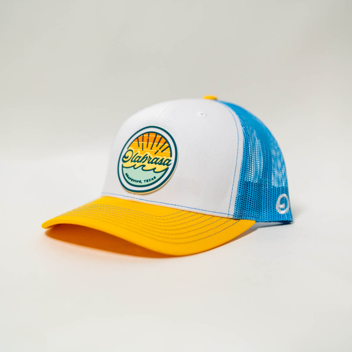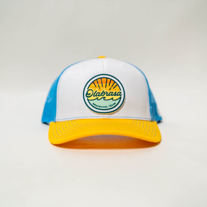 Inspired by surf days at the lake. Jump out of the water and put on your favorite hat! This curved bill trucker hat is perfect for summer. With a mesh back for optimal air flow and a slightly raised top you will stay cool and comfortable. Designed with our Olabrasa logo featured on a PVC patch and embroidered O on the side.