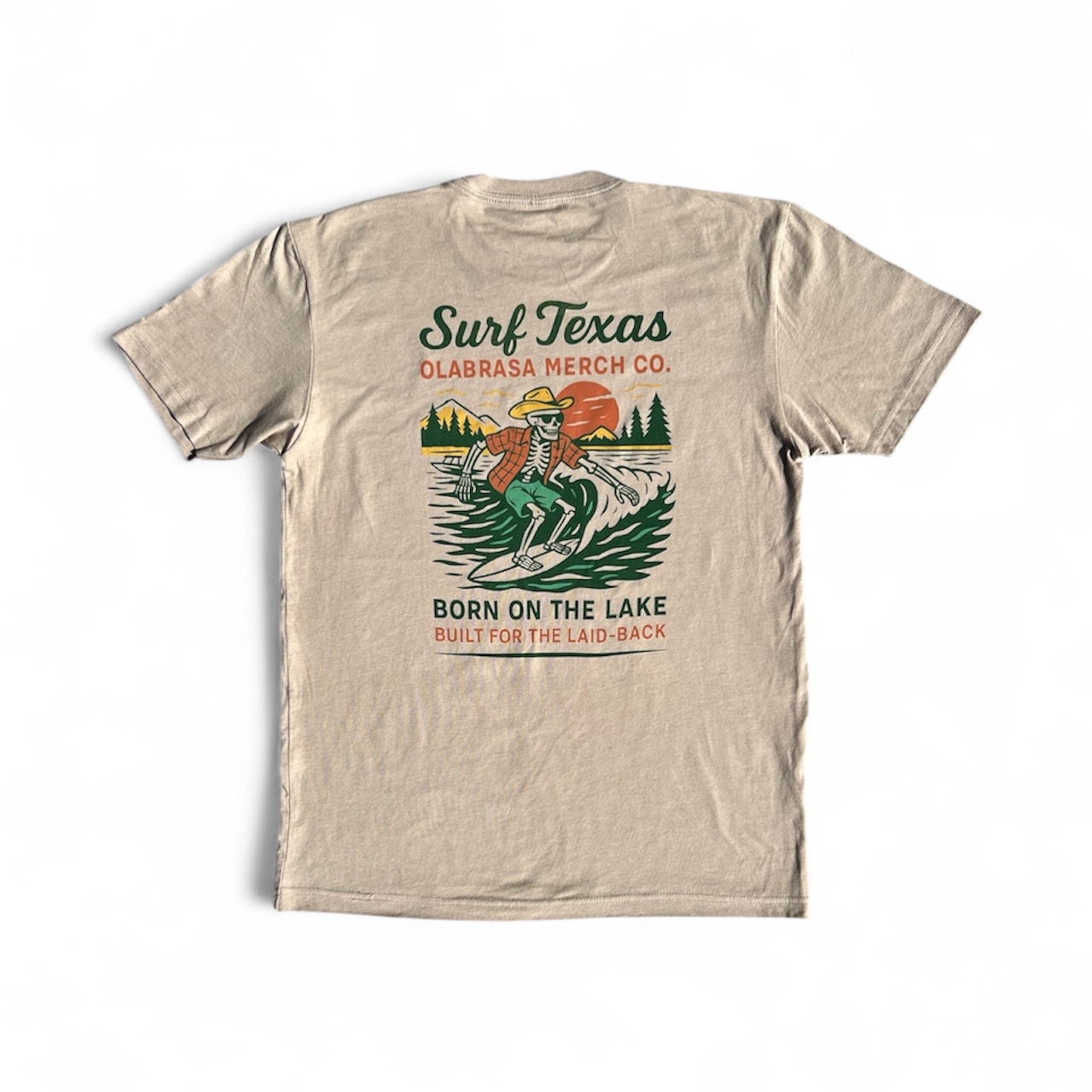 Cowboy skeleton ridin’ a lake wave under a Texas sunset—Surf Texas style. Premium cotton-poly blend, vintage-soft and built for laid-back lake days.